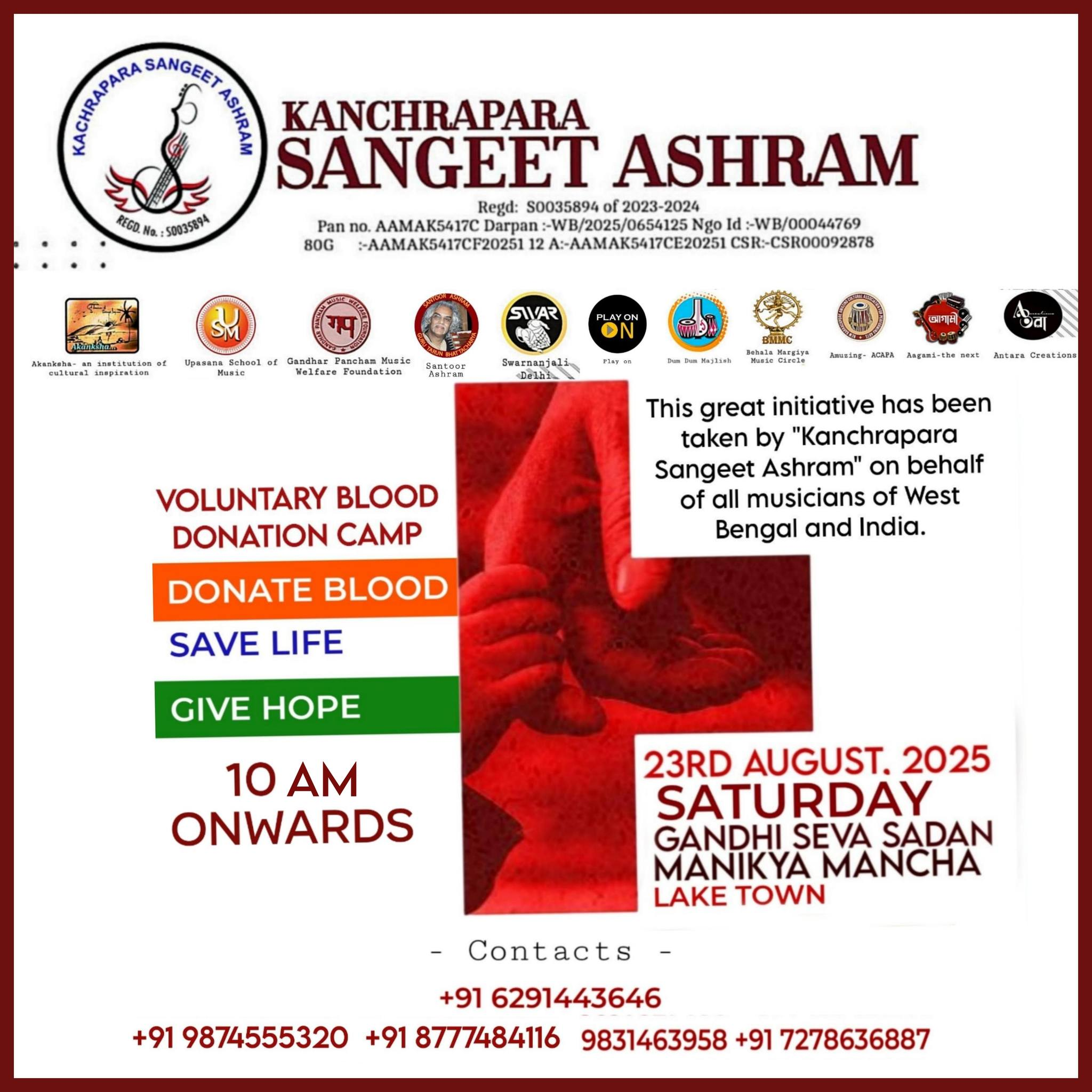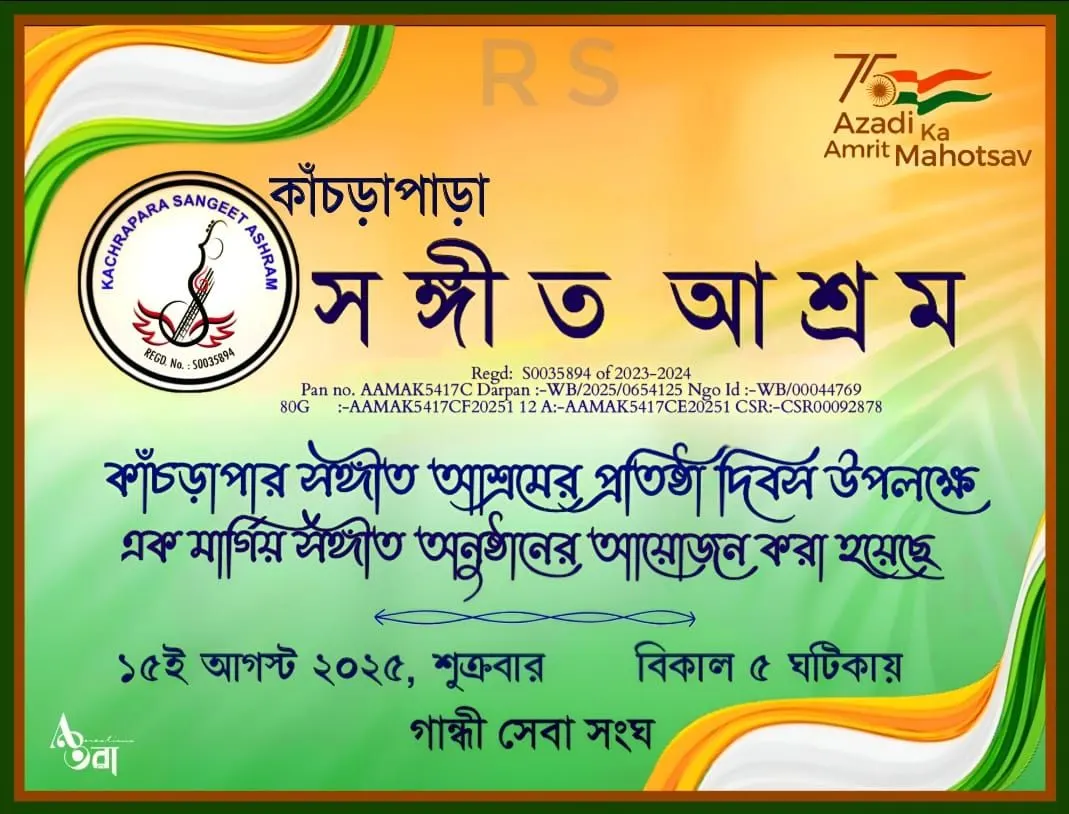 Kanchrapara Sangeet Ashram is a dedicated institute of Indian classical music, nurturing talent and spreading the rich heritage of our cultural traditions. Along with music training and performances, we also organize social initiatives such as blood donation camps, cultural events, and community programs to promote harmony and humanity. With a vision to blend art and service, we strive to create a platform where music becomes a path of learning, sharing, and giving back to society.